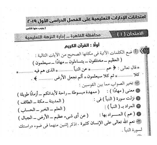 امتحانات الدين الاسلامى الصف الرابع الابتدائي ترم اول 2020